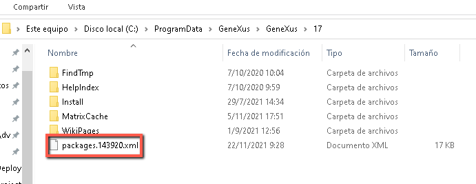 These files are generated in a folder with the name of the GeneXus version, but they do not consider having different updates, so a file is generated for all installations of the same version, that is, for GeneXus 17 there is only one folder that it is overwritten with each upgrade, the same for GeneXus 16, so you can have an installation of GeneXus 16 and GeneXus 17 without losing the references to the installed extensions.